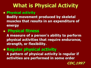 | A pattern of physical activity is regular if activities are performed most days of the week, preferably daily,5 or more days of the week if moderate-intensity activities are chosen or 3 or more days of the week if vigorous-intensity activities are chosen. |