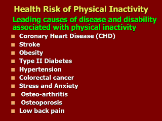 | A sedentary lifestyle is detrimental to health. Many of the leading causes of disease and disability in our society, such as Coronary Heart Disease (CHD), strokes, obesity, type II diabetes, hypertension, colorectal cancer, stress, anxiety, osteoarthritis, osteoporosis and low back pain, are associated with physical inactivity.1 |
