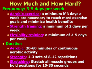 throughout the day have been shown to have significant health benefits Strength: 1-3 sets of 8-12 repetitions, involving 8-10 exercises that condition the major muscle groups Stretching: Stretch all muscle groups and hold positions for 10-30 seconds Intensity Two methods to monitor intensity: |