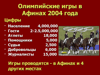благосостоянием. Олимпийские игры 2004 года потребовали значительных работ, которые улучшат качество жизни в столице Греции, например: новый международный аэропорт в Спате, дорога от Элефсины до Спарты, кольцевая дорога, трамвайный путь вдоль побережья и Олимпийская кольцевая трасса. http://www.athens2004.com/athens2004/ |