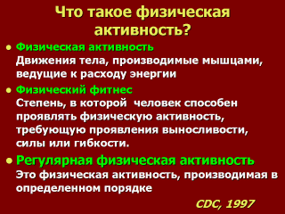 | Физическую активность можно назвать регулярной, если тренировки проводятся в большинство дней недели, лучше ежедневно; 5 и более дней в неделю - при умеренной физической нагрузке, 3 и более - при интенсивной. |