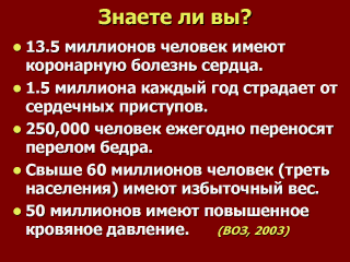 | Несмотря на доказанные преимущества физической активности, более 50% взрослого американского населения не занимаются ей в должной степени. 25% взрослых - вообще не занимаются упражнениями в свободное время. Активность падает с возрастом и менее популярна среди женщин, чем среди мужчин и среди части населения с меньшим доходом и более низким уровнем образования. Кроме того, существуют расовые и этнические ограничения, особенно у женщин. |