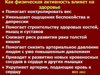 | Эта очевидность набирает силу и более доказательна сейчас, чем когда бы то не было! Люди всех возрастов, кто в общем неактивны, могут улучшить свое здоровье и самочувствие, став физически активными при занятиях средней интенсивности упражнениями на регулярной основе. (Доклад Центра Контроля Заболеваний, 1997) |
