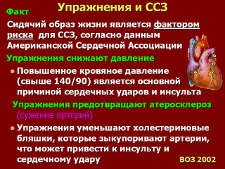| Сердечно-сосудистые заболевания - основная причина смерти американцев. Свыше миллиона подвергнутся в этом году сердечным приступам, 30% из них умрут сразу, а 10% умрут впоследствии в текущем году. Около 500,000 ожидает инсульт, 40% из них остануться инвалидами и 30% умрут в течение года. |