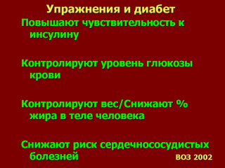 Рост чувствительности к инсулину . Исследования показали, что упражнения увеличивают способность тела использовать инсулин, которая улучшается в процессе переработки сахара теломКонтроль глюкозы крови. Глюкоза прямо из крови перерабатывается в энергию во время и после упражненийКонтроль веса/Ниже % жира. 4 из 5 человек с диабетом имеют избыточный вес; исследования показали, что при потере веса состояние больных диабетом улучшаетсяСнижение риска сердечно-сосудистых заболеваний. У больных диабетом риск заболеть ССЗ выше |