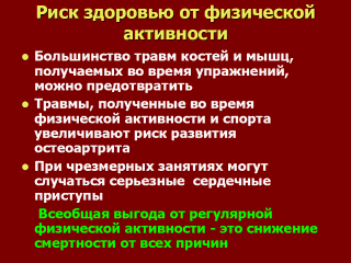 Хотя физическая активность имеет множество преимуществ, необходимо знать о потенциальных нежелательных последствиях неправильных тренировок. Большинство травм костей и мышц, получаемых во время упражнений, можно предотвратить постепенным достижением желательного уровня активности и избеганием чрезмерного количества упражнений. Травмы, полученные во время физической активности и спорта увеличивают риск развития остеоартрита, однако сама физическая активность не вызывает остеоартрит. При чрезмерных занятиях могут случаться серьезные сердечные приступы, однако повсеместная выгода от регулярной физической активности снижает общую смертность. |