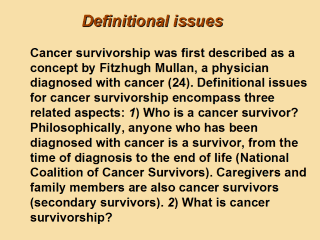 likelihood of recurrence is sufficiently low). An understanding of these phases of survival is important vis-a`-vis an optimal transition into and management of survivorship. 3) What is cancer survivorship research? Cancer survivorship research seeks to identify and examine adverse cancer diagnosis and treatment-related outcomes (such as late effects of treatment, second cancers and quality of life); provide a knowledge base regarding optimal follow-up care and surveillance of cancer survivors; and optimize health after cancer treatment. |