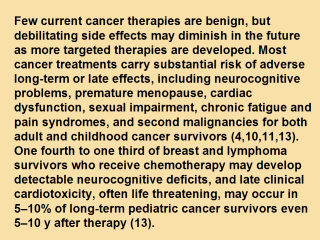 failure (10,11,13). Late effects can be classified further as system specific (such as damage, failure or premature aging of organs; immunosuppression or compromised immune systems; and endocrine damage), second malignant neoplasms (such as an increased risk of recurrent malignancy, a certain cancer associated with the primary cancer and a second cancer associated with cytotoxic or radiological cancer therapies) and functional changes (such as lymphedema, incontinence, pain syndromes, neuropathies and fatigue); cosmetic changes (such as amputations, ostomies and skin and hair alterations); and associated comorbidities (such as osteoporosis, arthritis, scleroderma and hypertension) (4,10,11,30). The spectrum of late and long-term complications ranges from minor and treatable to serious and lethal (11,13). |