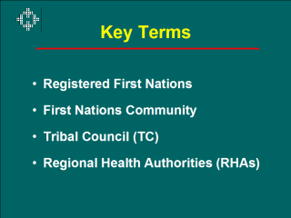 membership. First Nations (FN) communities - separate tracts of land often called "reserves," set aside specifically for the use of First Nations people, differentiated from other provincial boundaries under legal terms and treaties. Tribal Council (TC) - "a grouping of bands with common interests who voluntarily join together to provide advisory and/or program services to member bands" (Indian and Northern Affairs Canada). Regional Health Authorities (RHAs) - "autonomous health care organizations with responsibility for health administration within a defined geographic region within a province or territory. They have appointed or elected boards of governance and are responsible for funding and delivering community and institutional health services within their regions." (CCARH) |