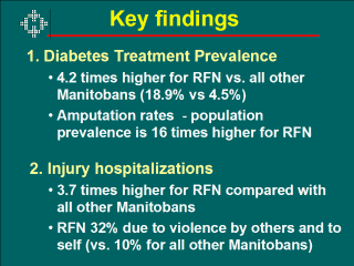 Causes of these injury hospitalizations vary substantially: Treatment for diabetes is more than four times as high for RFN people compared to all other Manitobans. Thus, one would expect to see an adverse outcome of diabetes, such as lower limb amputation, to be four times as high. In reality, RFN people are about sixteen times as likely to have an amputation as a result of diabetes.