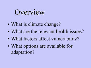 briefly describing climate change, then summarize the potential health impacts. I then consider what factors affect vulnerability to climate change and what policies are available to reduce the likely health impacts. |