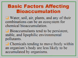an environment for bioaccumulation of these pollutants. Not all environmental pollutants, including those capable of causing endocrine disruption, are prone to bioaccumulation. As expected, contaminants that are more stable in the environment are those having relatively longer half-lives (for definition see Slide 15). These pollutants are the ones tending to pose greater threat of bioaccumulation within an ecosystem. Posing even greater threat are those chemicals that are fairly resistant to metabolism once inside an organism. Chemicals that are lipophilic (fat soluble or fat-loving) can be stored in fat deposits for many years inside an organism. It is these persistent, stable, and lipophilic chemicals that are likely to be accumulated by animals and eventually by humans.In general, chemicals that tend to move freely within an organism’s body, or to be excreted rapidly from the body, are less likely to be bioaccumulated. Thus, the accumulation would be more in an old trout than in a young yellow perch from the same lake, since the former is a relatively larger, fatter, and long-lived fish that has a lower rate of excreting a chemical. |