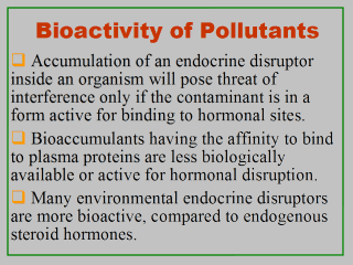 that is more bioavailable tends to be more potent. Once inside an organism, pollutants would travel to organs and tissues via the bloodstream. At any given time, chemicals inside an organism are present either bound or unbound to plasma proteins in tissues and organs. In most cases or fortunately, lipophilic chemicals including most endocrine disruptors tend to travel through the bloodstream bound to carrier proteins or plasma proteins, similar to endogenous hormones. As many endocrine receptors are located within a cell, endogenous hormones or hormone-like exogenous chemicals must be free to pass from capillaries into cells to cause a disruption effect. In any case, it is the unbound fraction of these chemicals that are considered biologically active or available. Proteins that bind to hormones include steroid-hormone binding globulins and non-specific proteins such as albumins. Different endocrine toxicants will have unique or specific binding interactions with different plasma proteins. Thus, the concentration of plasma proteins, the type of proteins, the plasma flow rate, and the binding kinetics between toxicants and their plasma proteins will all affect the amount of a toxicant in the bioactive form. |