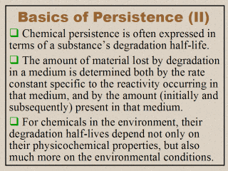 many environmental contaminants are present in more than one place. The amount of material lost by degradation in a particular medium is determined both by the rate constant specific to the reactivity occurring in that medium, and by the amount present in that medium. It follows that for persistence in the overall environment composing the media of concern, the degradation rate constants for those individual media must be known. At the least, an assessment model for integrated persistence should weigh the persistence in the various media according to where a substance is likely to reside (Wania, 1998). Again, it is important to note that for chemicals in the environment, their degradation half-lives depend not only on their molecular structure and physicochemical properties, but also greatly on the environmental conditions in which they are present. In any given environment, a chemical’s persistence is susceptible to one or more of the four basic removal processes: photolysis (breakdown by sunlight); chemical decomposition (breakdown through chemical reaction): microbial decomposition (breakdown by microorganisms); and mobility. These are the same four types applied to pesticide persistence by Kerle et al. (1996). In their pesticide terms, mobility can be accomplished through sorption to soil particles or vegetation, uptake by plants, volatilization into the atmosphere, and runoff or leaching to the nearby water table. |