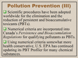1998). Another example is Canada’s Persistence and Bioaccumulation Regulations authorized under the Canadian Environmental Protection Act (CEPA, 1999). Included in these Canadian regulations are numerical criteria for classifying the persistence, bioaccumulation, and other relevant properties of PBTs. These numerical criteria, as briefly described in Slide 8, are similar to the UNEP’s.Using numerical criteria somewhat more health conservative, U.S. EPA has continued updating its PBT Profiler used to provide estimates of the persistence, the bioaccumulation, and the chronic fish toxicity potential for many chemical substances. The use of fish toxicity apparently reflects U.S. EPA’s current focus on aquatic pollution. This profiler is basically a screening tool designed to highlight toxic substances that may persist or bioaccumulate in the (aquatic) environment. It is of note that even though the PBT Profiler adopts criteria set forth recently in the Federal Register (U.S. EPA, 1999), the numerical estimates for the PBT properties are actually based on those scientific principles that have been used for years by the agency’s New Chemical Program developed for screening toxicity. |