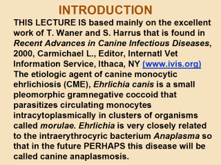 Ehrlichia canis (Donatien and Lestoquard 1935) Moshkovski 1945 Human anaplasmosis used to be called erhlichiosis or human granulocytic ehrlichiosis (HGE). This anemia is caused by Anaplasma phagocytophila, Ehrlichia equi and HGE which seem to be one species that has 3 or more strains. Also, Ehrlichia seems to be a synonym of Anaplasma. The sequencing of nucleotides to yield some sort of phylogeny has not yet progressed far enough in this group of microorganisms so that definitive statements can always be made. How closely related are E. equi and E. canis ? The new taxonomy is yet to come. E. canis was first recognized in Algeria in 1935. It assumed great importance during the Vietnam war, causing the death of hundreds of military dogs. The disease has received further attention in 1987 when the closely related organism E. chaffeensis that seems to be a synonym of E. canis was identified as the cause of human monocytic ehrlichiosis now called human anaplasmosis. In 1996, E. chaffeensis was shown to cause disease symptoms in dogs indistinguishable from E. canis infection. |