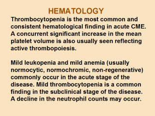 during the chronic stage of CME. Severe pancytopenia is the hallmark of the
