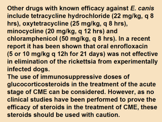 When demonstrating other Rhipicephalus-borne parasites such as Hepatozoon canis or Babesia canis, in blood smears, coinfection with E. canis should always be considered, as this is sometimes common. Coinfections with E. platys, which is presumed to be transmitted by Rhipicephalus sanguineus, the brown dog tick are also common. Concurrent infections of E. canis and Borrelia burgdorferi or Leishmania donovani have been documented, indicating the strong possibility of coinfections with other parasites, that are not transmitted by ticks. Standard inseticide-impregnated dog collars efficiently protect against ALL insect-borne parasites. |