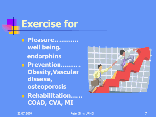 pain and provide "a high". Athletes can become "addicted" to their training schedules and if for any reason they cannot train suffer the misery and withdrawal of the addict. Regular exercise is important in maintaining body weight, probably by reducing appetite. The blood sugar level tends to drop lower in people when they are not exercising-they feel hungry and are more likely to "snack" on easily available carbohydrate. Exercise to lose weight is not particularly effective - a kilogram of fat is the equivalent of 9,000 kilocalories or two/three days of vigorous exercise. Exercise in building fitness after acute illness or in improving performance in chronic disability is well proven. Performance can be increased, morale raised and quality of life enhanced by being able to walk 20 metres rather than 5, to be able to wash and shave without becoming totally incapacitated. |