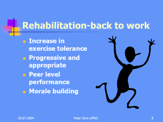 an increasingly important part of modern medicine. Patients survive major illness and injury but may be crippled in mind or body in consequence-the loss of a limb, severe scarring, loss of a breast, problems of weakness, difficulties with speech, problems of coordination, reduced physical strength. The whole body image can be distorted and ugly to the patient. (We all have a self image which we perceive favourably, love, care for and preen) With illness or accident this self image can be cruelly shattered-the patient now rejects this hulk, relapses in to despair and depression with a further diminishing of performance. Rehabilitation requires the skills of Psychologist, Occupational Therapist and Physiotherapist in introducing a graduated programme of exercise and activity; where success is possible through small steps often taken in a group with other people suffering the same sort of problems. Morale is raised, people come alive again, life is worth living and the ability to be once more part of the world of people and work - be it paid work, voluntary work, house work, or hobby. |