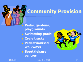 responsibility for making exercise "an easy option". Provision of easily accessible and cheap facilities of good standard - tennis courts, golf,bowls is worthwhile. The London Parks are "the Lung of London", they are well used by walkers, joggers, lovers, visitors who walk, talk, lie in the sun, kick a ball or exercise a dog. Schools usually have gymnasia, sometimes a swimming pool or running track. These facilities are often unused at nights or weekends and instead could be made available to the neighbourhood. Walkers, joggers and cyclists need to feel safe and the provision of walkways, cleanliness, scenery and policing are important e.g the river walks in Australia’s main cities. |
