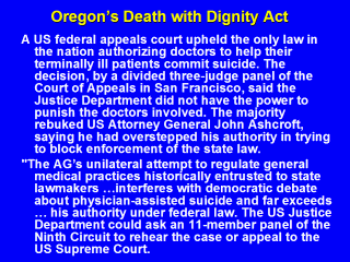 The assisted-suicide law in Oregon is the product of a 1994 voter initiative. It allows adults with incurable diseases who are likely to die in six months to obtain lethal drugs from their doctors. The doctors may prescribe but not administer the drugs, and are granted immunity from liability. About 30 people a year have used the law to end their lives since it became effective in 1997, about one per thousand deaths in Oregon. The court was not deciding the morality or appropriateness of assisted suicide and gave no opinion on whether the practice is inconsistent with the public interest or constitutes illegitimate medical care. This case is simply about who gets to decide. State governments bear primary responsibility for evaluating physician-assisted suicide. In our concept of federalism, and state lawmakers, not the federal government, are primary regulators of professional medical conduct. " NY Times, May 27, 2004 |