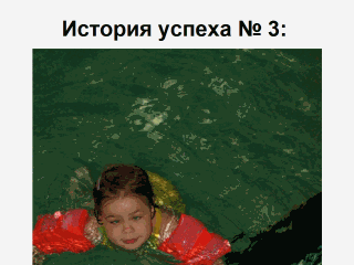 | Мама Д.А.: «Моя дочь не пропустила ни одного занятия! Участие в проекте ей очень нравится! Особенно плавать! Тренер постоянно находится с ней в воде и она может плавать часами, пока уже не посинеет от холода. Мы очень благодарны руководителям проекта за предоставленную возможность в помощи нашей дочери забыть о своих болезнях и почувствовать вкус жизни.» |