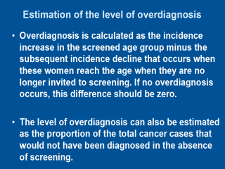 | Overdiagnosis is essentially the incidence increase due to screening and may be defined statistically. Earlier diagnosis will always lead to an incidence increase and some overdiagnosis. Overdiagnosis cannot (at present) be defined on the individual level. |