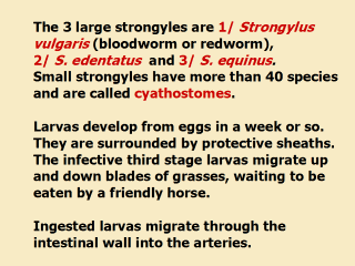 pressure may cause the wall to balloon out to form an aneurysm. Adult large strongyles attach to the mucosa of the cecum and large colon and suck blood, causing inflammation and bleeding ulcers in the intestinal lining. The large strongyle, 1/ S. vulgaris, causes severe damage to the anterior mesenteric artery and its branches, resulting in aneurysms, emboli and thrombi. |