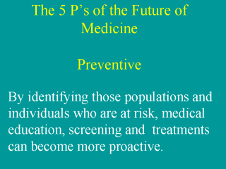 | Preventive. As it becomes more possible to identify certain populations and individuals who are at risk, medical education, screening and treatments can become more proactive. By initiating preventive medicine programs, vaccines, treatments, etc it will become increasingly possible to prevent disease rather than treat the acute and chronic sequella. |