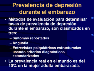 Angustia: Las tasas de angustia varían a través de poblaciones. 42% de la población Hindú reportó angustia durante el embarazo, medida por el Cuestionario General de Salud (Patel V, Rodrigues M, DeSouza N (2002). Gender, poverty, and postnatal depression: a study of mothers in Goa India. American Journal of Psychaitry 159:43-47. En una población del Reino Unido, 10% reportaron angustia durante el primer trimestre y 15% enin the second and third trimeel segundo y tercer trimestre, Kumar R, Robson KM (1984). A prospective study of emotional disorders in childbearing women. British Journal of Psychiatry 144:35-47. En una población danesa, la tasa de angustia durante eñ tercer trimestre es similar a la tasa en el Reino Unido usando el mismo intrumento para evaluar angustia. La tasa para la angustia en el tercer trimestre es del 17%. Hedegard M, Henrikesen TB, Sabroe S, Secher NJ (1993). Psychological distress in pregnancy and preterm delivery. British Medical Journal 307:234-239. Casos verdaderos de depresión: De toda la literatura publicada, la tata real de depresión es delrededor del 10% a nivel mundial. Esta tasa es más la más baja y el rango es de 6 a 24%. El más alto número de casos reales es encontrado en poblaciones dentro de las ciudades. |