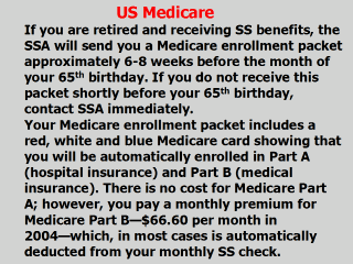If you do not receive this packet shortly before your 65 th birthday, contact SSA immediately. This means that once you have met your annual deductibles, if applicable ($100 for Medicare Part B and $200 for HealthSelect), Medicare generally pays 80 % of eligible charges and your state health plan coordinates to pay secondary. If you are a HealthSelect member, HealthSelect pays 70 % of the allowable charge for services not covered by Medicare such as routine medical care provided outside the US. |
