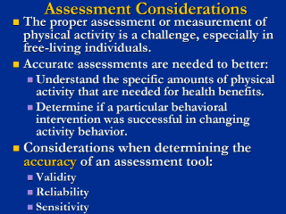 Accuracy is the degree to which an assessment tool is able to measure physical activity and/or exercise. Accuracy is comprised of both validity and reliability. Validity is the degree to which an instrument measures what it sets out to measure. Reliability of an assessment tool relates to it’s repeatability. Will the results that were obtained with a particular assessment tool be replicated if the test is repeated? Sensitivity relates to the ability of an assessment tool to accurately measure and detect change in physical activity patterns. Recommended Reading: Welk GJ (2002). Physical activity assessments for health-related research. Champaign, IL: Human Kinetics. |