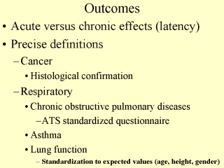 | Use of standardized and well-tested questionnaires is crucial, such as the American Thoracic Society respiratory questionnaire. Other sources include environmental questionnaires (Lebowitz et al., 1989) and the Agency for Toxic Substances and Disease Registry (ATSDR) of the CDC. |