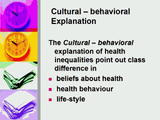 | Diet is influenced by both cultural preferences and disposable income; the prevalence of obesity is higher in manual than non-manual groups, where health is a matter of individual responsibility and free choice influences attitudes based on knowledge. Manual class people are more likely to adapt to fatalism, have short-term goals, low expectations of life and bolder attitude towards taking of risks. |