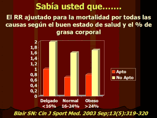 | La gordura y la falta de un buen estado de salud son asociados con una mortalidad por todas las causas y una mortalidad cardiovascular. Comparado con mujeres aptas/mujeres sin grasa, las proporciones del peligro proporcional-Cox ajustado para la mortalidad por todas las causas, son mayores para mujeres aptas/grasa (1.32 [P < 0.05]), no aptas/sin grasa (1.30 [ P <0.05]) y no aptas/con grasa (1.57 [P <0.05]). |