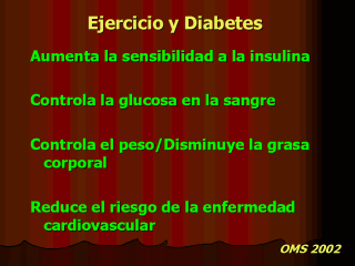 sensibilidad a la insulina Se ha demostrado que el ejercicio aumenta la capacidad del cuerpo para utilizar la insulina, lo que mejora la forma en que el cuerpo emplea el azúcar. Controla la glucosa en la sangre El ejercicio elimina directamente la glucosa de la sangre, para utilizar la energía durante y después de la actividad. Control del peso/Disminuye la grasa corporal Cuatro de cinco personas con diabetes tienen exceso de peso Los estudios realizados demuestran que cuando los diabéticos bajan de peso, su condición mejora Reduce el riesgo de enfermedad cardiovascular Las personas con diabetes se encuentran en un riesgo aumentado de ECV . |