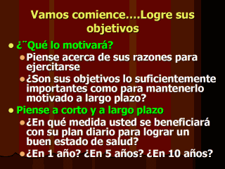 Ejercicio para la vida por Melissa www.som.tulane.edu/groupsbht/ Presentations/exercise.ppt Ejemplos Objetivos de salud Objetivos para un buen estado de salud Deseo correr en una carrera |