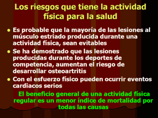 State Med Assoc. 2004 Jan;97(1):18-21 Aunque la actividad física tiene numerosos beneficios para la salud, existen posibles efectos secundarios, asociados con el estar físicamente activo, oscilando desde aquellos que producen una inconveniencia menor hasta aquellos que pueden poner en peligro la vida. Es probable que la mayor parte de las lesiones al músculo estriado, relacionadas con la actividad física sean evitables mediante el funcionamiento gradual hasta un nivel deseado de actividad y evitando una cantidad excesiva de ésta. Aunque no existen pruebas de que la actividad física como tal provoque osteoartritis, se ha comprobado que las lesiones causadas durante los deportes de competencia, aumentan el riesgo de desarrollarla. Aunque pueden ocurrir eventos cardiacos serios con el esfuerzo físico, el beneficio general de una actividad física regular es menor que la mortalidad por todas las causas. |
