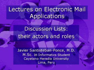 Since 1993 he has been a member of diverse e-mail discussion lists, and since 1997 he assumed roles as moderator of discussion lists and administrator of listservers. This is a set of slides about the way e-mail discussion lists work, how to subscribe to discussion lists and how to find lists about particular themes.