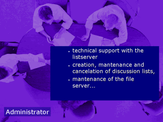 The ADMINISTRATOR of an e-mail discussion lists has functions like "securing the equipment which maintain the discussion list is working fine". This tasks could be hard to maintain on very active LISTSERVERS or those with many lists, as is the case of Mailbase in Great Britain (http://www.mailbase.ac.uk). |