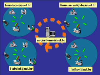(Description for each list): epistemica-l (Science philosophy and history) l-abebd (Economy librarian professionals) l-infsoc (Applied computing to social sciences) l-materno (Discussion on breastfeeding) linux-security-br (Linux-platform security discussion) oracle-l (Oracle databases discussion) NOTICE: This information is obtained by sending a message to majordomo@uel.br