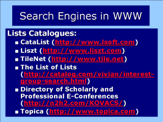 Search for discussion lists in LISTSERVERS which operate with Listserv (R), a software program for e-mail lists management from LSoft (R). Certain LISTSERVERS doesn’t allow their listing on this catalogue, but it’s a useful search engine for academic LISTSERVERS. The lists whose LISTSERVERS use another e-mail lists management software program (Majordomo, Lyris, Mercury, Listproc, etc.), are not identified by CataList. Liszt Allows searches by words or by categories. Contains information about lists independently from software program which manages each LISTSERVER. Contains numerous lists, and although doesn’t include all the known lists, it’s a very useful resource. Useful as complement to CataList. TileNet Searches for discussion lists independently from the type of LISTSERVER, including those which operate with Lyris. Is useful to complement searches from CataList. The List of Lists Searches and offers a catalogue of lists independently of the type of LISTSERVER which operates them. Directory of Scholarly and Professional E-Conferences Useful for the selection of academic discussion lists. Topica Provider of discussion list services management by free at their own LISTSERVER. Catalogues their own managed lists and any other discussion lists available on the Internet, regardless of the type of LISTSERVER. When including lists from Topica in the searches, the output could be large, but with many non-academic lists.