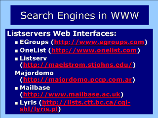 EGroups Searches for discussion lists in LISTSERVERS of EGroups, a free/paid discussion lists management service. Any list from EGroups could block its inclusion in the search engine catalogue depending on the list MODERATOR / ADMINISTRATOR decision. Those lists whose LISTSERVER doesn’t operate inside EGroups are not searched by this engine. The most dependable and academic health lists do operate in LISTSERVERS from academic / government institutions. OneList Doesn’t exist just as it was, since OneList has been incorporated into EGroups. Please refer to Egroups in the future. Listserv The LISTSERVERS which operate with Listserv (R) could offer a web interface for searching discussion lists locally instead of using CataList search engine. An example of web interface from a LISTSERVER using Listserv is RedIris from Spain. Usually CataList permits to find the same information if the LISTSERVER hasn’t been blocked from appearing in the search engine catalogue. Majordomo Is a free licence software program for LISTSERVERS oeprating under Linux or Unix operating systems. Some of these LISTSERVERS with Majordomo offer a web interface to search discussion lists locally. Unfortunately there are not search engines like CataList, which include all the LISTSERVERS working with Majordomo. An example of web interface for Majordomo: http://www.majordomo.com . Mailbase This LISTSERVER from United Kingdom, manages more than 2000 lists for different academic issues. Mailbase offers a web interface to search lists, subscribe/un-subscribe, review archive files, etc. Lyris This program for LISTSERVERS has a web interface to search for discussion lists. An example: The Centre for Curriculum Transfer & Technology in Canada. Remember that TileNet is a search engine that includes LISTSERVERS which operate with Lyris but also with other type of software for lists management.