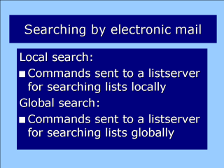 Searching locally on a LISTSERVER, by sending an e-mail to the same LISTSERVER, with an order to reply with a listing of all the discussion lists which supports. Searching on a LISTSERVER which stands as capable for extending the search request to other LISTSERVERS. This kind of search works for Listserv type LISTSERVERS.