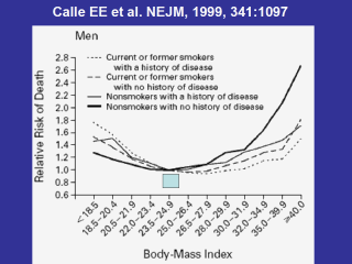 | Multivariate Relative Risk of Death from All Causes among Men and Women According to Body-Mass Index, Smoking Status, and Disease Status.The four subgroups are mutually exclusive. Nonsmokers had never smoked. The reference category was made up of subjects with a body-mass index of 23.5 to 24.9. |
