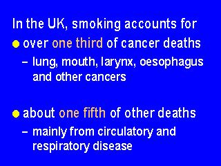 Smoking is more prevalent in the more disadvantaged social classes. For many years, the UK government - shamefully - yielding to vested interests and did little to discourage smoking. Smoking prevention is now government policy and they plan to ban tobacco advertising. Further reading: |