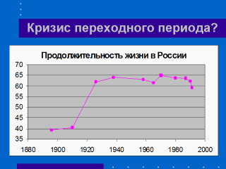 | В конце 60х годов в Советском Союзе стала снижаться продолжительность жизни. Наблюдался и короткий период повышения младенческой смертности (1972-1975). Стало ясно, что Советский Союз стал первой и единственной промышленно-развитой державой,в которой отмечено снижение продолжительности жизни. Правительство Советского Союза ответило отказом передавать данные по смертности в ВОЗ и другие международные организации. |