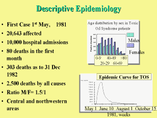 rates were recorded. On 10 June 1981, a public announcement about the causal agent of the epidemic was made. This finding coincided with the epidemic curve having reached its peak and initiated a slow decrease. Some days later, an exchange of the suspect oil with pure olive oil was initiated by the Government to prevent that more people were affected. Women were more affected than men; above all, those of less than 40 years who presented a higher mortality risk by TOS along the years. |