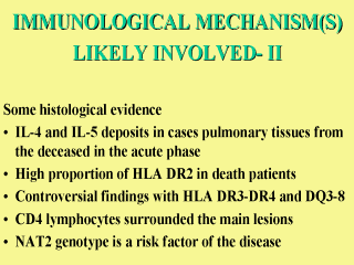 of TOS justify the hypothesis of an autoimmune mechanism involved. On the other hand, the presence of a specific gen that codes enzymes with a high likelihood of being involved in the metabolism of the substances strengthen the idea on individual susceptibility and of the different responses observed in patients. del Pozo V, de Andres B, Gallardo S, et al. Cytokine mRNA expression in lung tissue from toxic oil syndrome patients: a TH2 immunological mechanism. Toxicology 1997;118(1):61-70. Cardaba B, Gallardo S, Del Pozo V, Ezendam J, Izquierdo M, Martin C,Cortegano I, Aceituno E, Rojo M, Arriete I, Palomono P, Posada de la Paz M, Lahoz C. DR2 antigens are associated with severity of disease in Toxic Oil Syndrome (TOS). 2000. Tissue Antigens, 2000. 55(2): 110-117. |